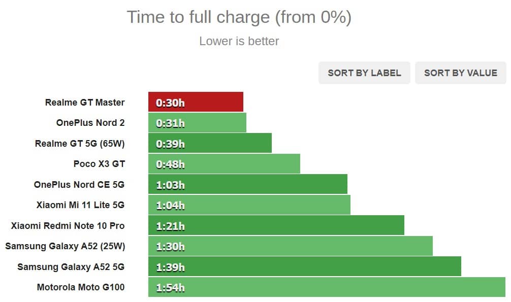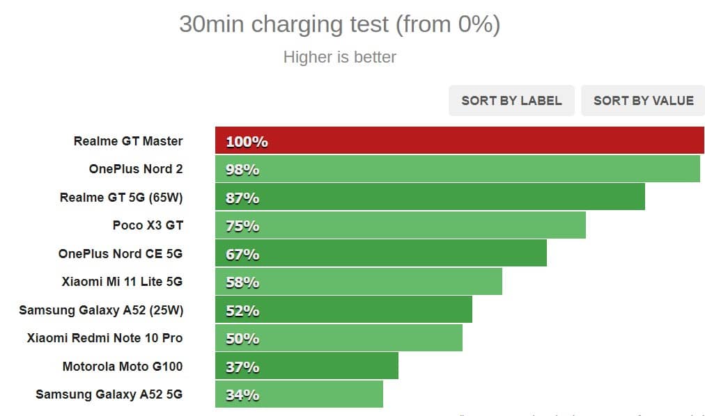 شارژ کامل گوشی تنها ۳۰ دقیقه طول میکشد. البته گوشی پیش از نمایش دادن پیام «شارژ شد» تا چند دقیقه دیگر به شارژ شدن ادامه میدهد. با توجه به اینکه ریلمی در تبلیغات خود اعلام کرده بود که باتری GT Mater در مدت ۳۳ دقیقه به طور کامل شارژ میشود، هیچ خردهای نمیتوان به آن گرفت. جی تی مستر با یکی از سریعترین سیستمهای شارژ سریع بازار همراه شده است.