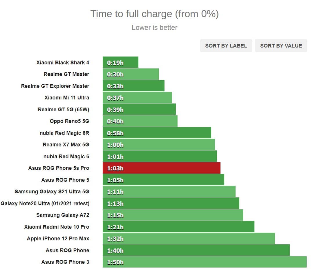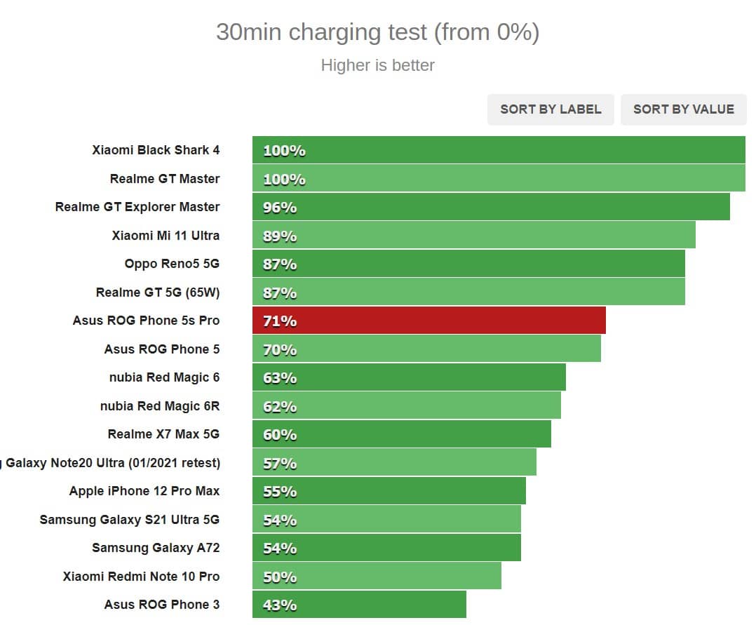 در تست انجام شده ۷۱ درصد از ظرفیت باتری در ۳۰ دقیقه اول پر شد؛ اما شارژ کامل گوشی یک ساعت و سه دقیقه طول کشید که فاصله زیادی با ادعای ایسوس دارد. با این وجود نتایج به دست آمده برای ایسوس راگ فون 5s پرو نسبتا خوب تلقی میشوند.