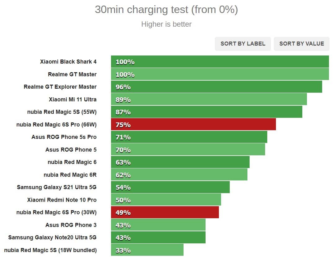 پس از این نوبت به استفاده از یک شارژر ۱۰۰ وات استاندارد رسید. خوشبختانه رد مجیک 6 اس پرو این بار هیچ مشکلی نداشت و با سرعت بالایی شارژ شد. در مدت ۳۰ دقیقه ۷۵ درصد از ظرفیت باتری این گوشی پر شد. این در حالی است که با استفاده از شارژر ۳۰ وات در مدت مشابه حداکثر ۴۹ درصد از باتری پر میشد.