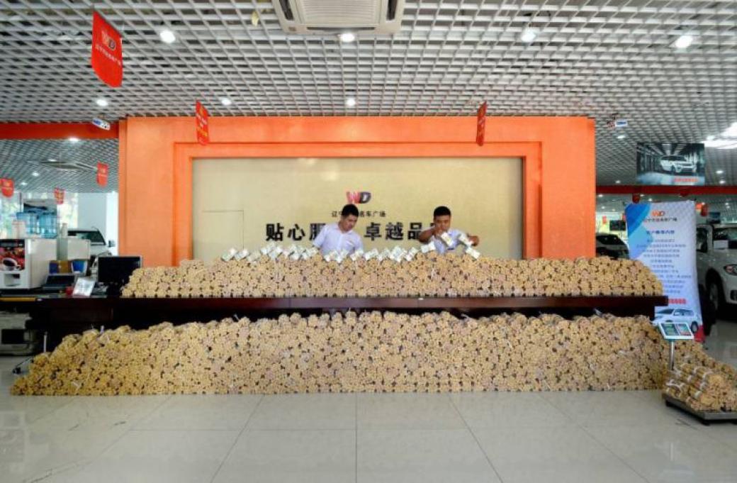 این شخص با اراده چینی ، سکه های خود را در ۱۳۲۰ بسته مرتب کرده و آن ها را با کاغدهای قهوه ای و با سلیقه فراوان بسته بندی کرده بود. کارکنان فروشگاه خودرو در استان لیائونینگ چین ساعت ها زمان صرف کرده اند تا این سکه ها را بشمارند. عکس هایی که از این خرید تاریخی ثبت شده اند، تلی از سکه ها را نشان می دهد که در فروشگاه بر روی هم انباشته شده اند.