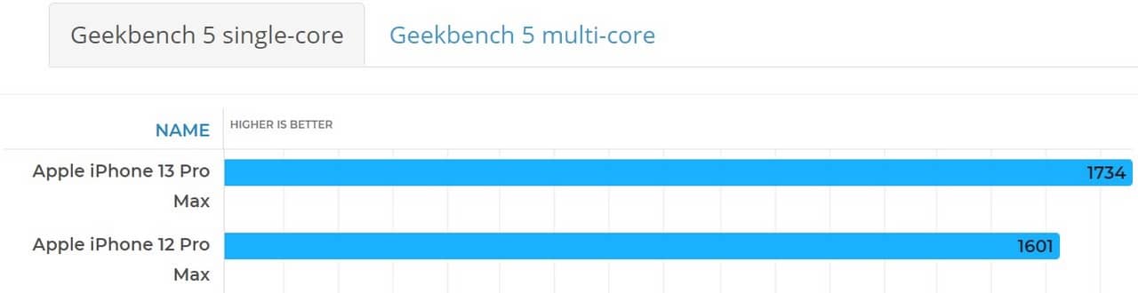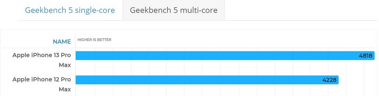 اپل امسال در اقدامی عجیب به مقایسه سرعت چیپ A15 و A14 نپرداخت و در عوض A15 را با رقبای اندرویدی مقایسه کرد. در اینجا میتوانید نتایج بنچمارک آيفون 13 پرو مکس در گیک بنچ را با آيفون 12 پرو مکس مقایسه کنید.
