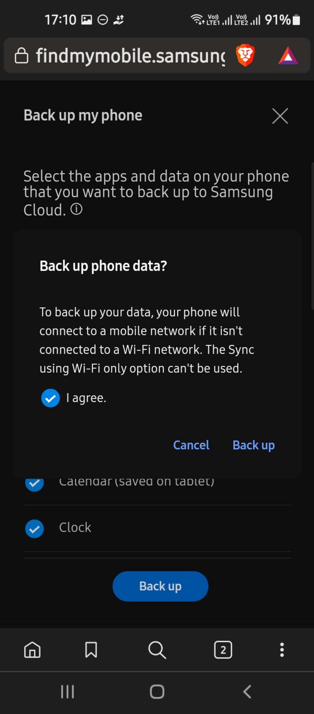 - در پنجره ظاهر شده روی گزینه I agree کلیک کنید تا مجوزهای لازم اعطا شود، سپس روی دکمه Back up کلیک کنید تا فرآیند تهیه نسخه پشتیبان شروع شود.