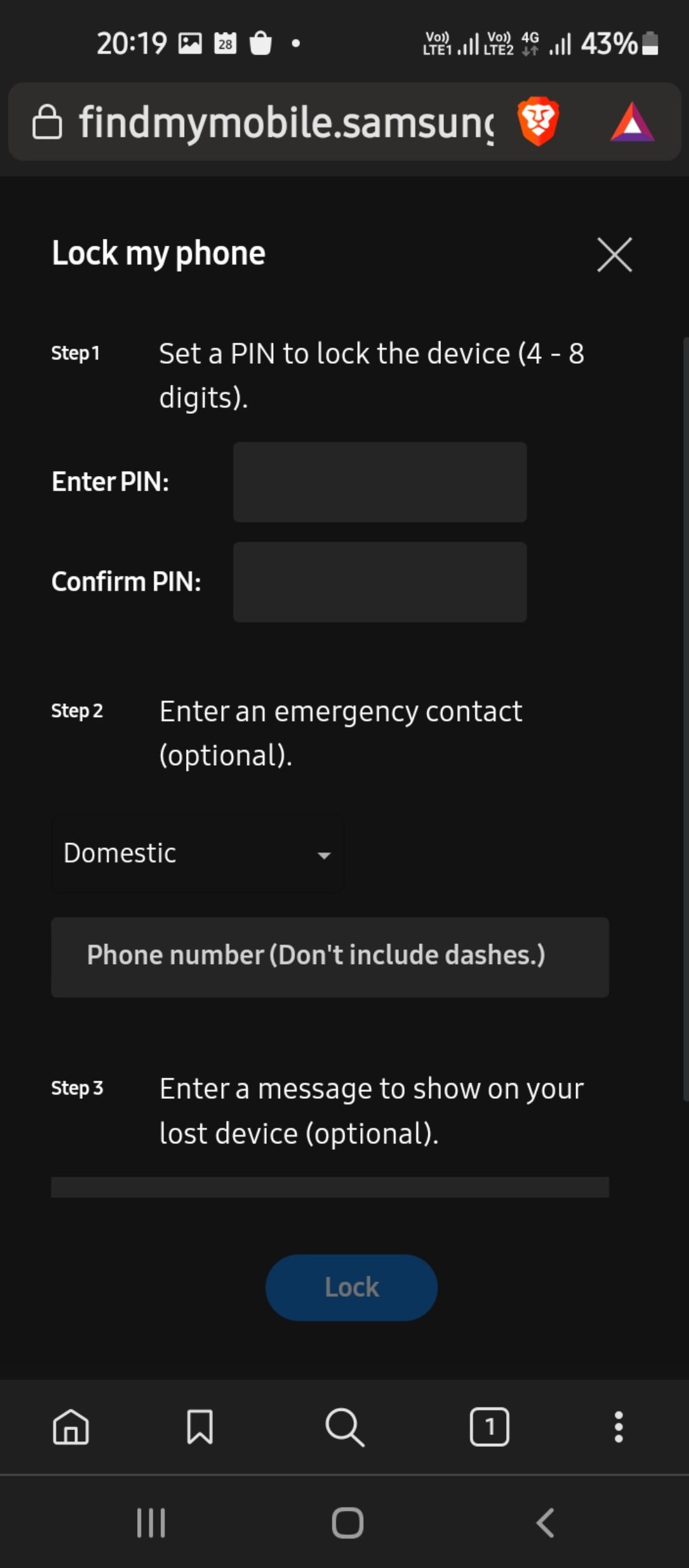 - یک پین چهار رقمی موقت را وارد کرده و روی Lock کلیک کنید. همچنین میتوانید اطلاعات تماس اضطراری و یک پیام دلخواه را وارد کنید.
