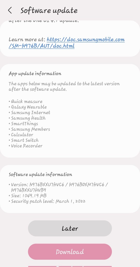 حجم این بروزرسانی 1049 مگابایت است و تغییراتی چشمگیر را در برخی اپلیکیشنهای سامسونگ ایجاد میکند. نسخه فریمور این آپدیت N976BXXU7HVC6 است و بروزرسانی امنیتی اول مارس را نیز به همراه خود دارد.
