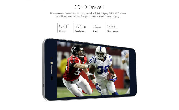 همانطور که گفتیم، برگ برندهی این گوشی در مشخصات بالایش است. صفحه نمایش این گوشی ۵ اینچی و با وضوح نمایش ۷۲۰ در ۱۲۸۰ پیکسل است، از پنل LTPS بهره برده و تراکم ۲۹۴ پیکسل در هر اینچ را خلق میکند. در کالبد این دستگاه، پردازندهی چهار هستهای مدیاتک MT6580A نهفته که اورکلاک ۱.۳ گیگاهرتز، رم ۲ گیگابایتی و ۱۶ گیگابایت حافظهی داخلی به همراه دارد. پیکاسو از مودم التیای ( LTE ) پشتیبانی نمیکند.