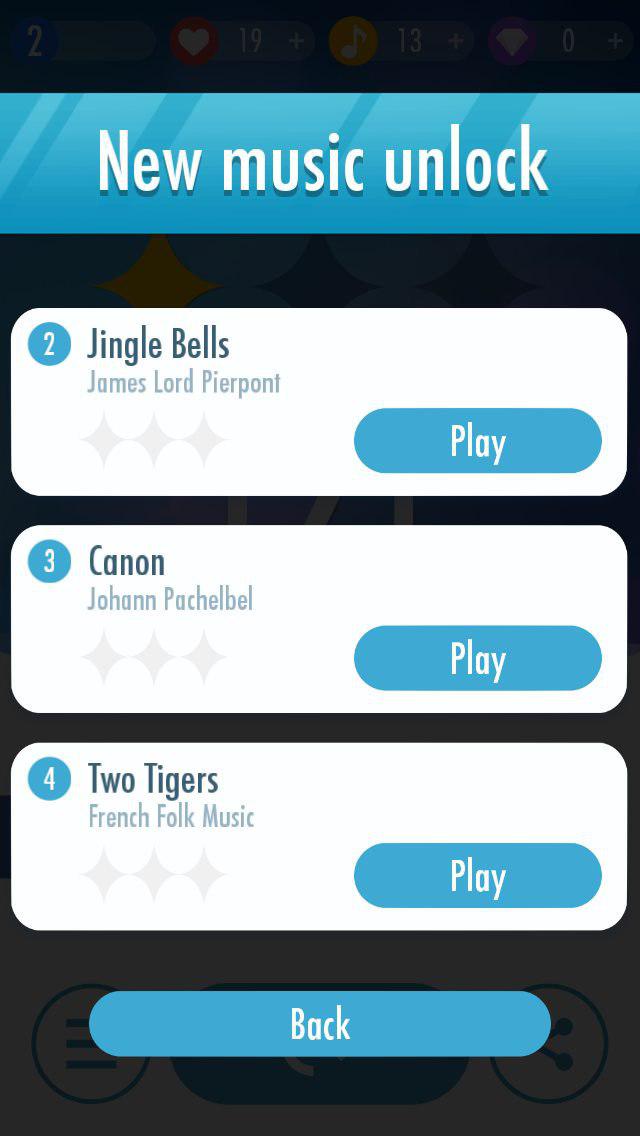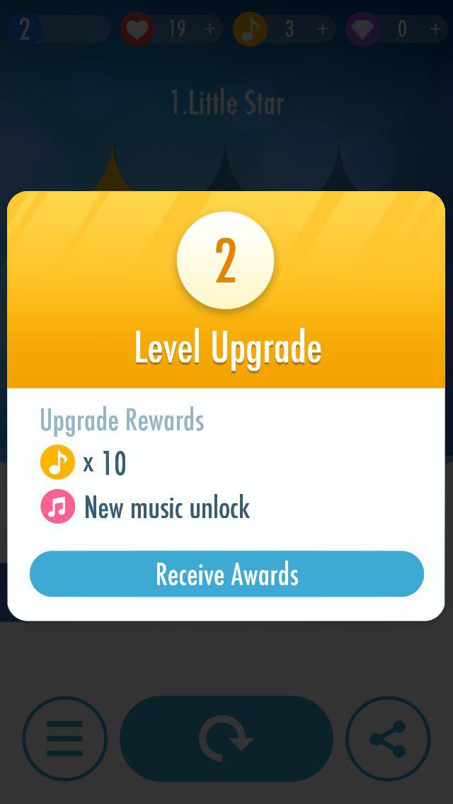 Piano Tiles 2 review 9با تکمیل کردن سه ستاره‌ی هر مرحله نیز تعدادی سکه‌ی موسیقی و مقداری امتیاز تجربه نصیب‌تان می‌شود. همچنین سه موسیقی جدید در اختیارتان قرار می‌گیرد که می‌توانید یکی از آنها را به عنوان مرحله‌ی بعدی انتخاب کنید و بازی را ادامه دهید. ارتقا به لول‌های بالایی نیز جوایز مشابهی را در اختیارتان میگذارد. همچنین توجه داشته باشید که می‌توانید عکسی از پیشرفت خود در بازی را به صورت اسکرین‌شات تهیه کنید و از طریق ایمیل و یا فیسبوک با دوستان‌تان به اشتراک بگذارید.