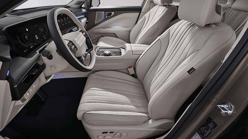 طراحان کیا بهروزرسانیهایی را در کابین کی 8 هم اعمال کردهاند. کنترلهای سیستم تهویه به پایین دریچههای مرکزی منتقل شدهاند، نوار الایدی به کابین اضافه شده و از مواد سافت تاچ بیشتری در اجزای فضای داخلی استفاده شده است. در زمینه امکانات ایمنی هم لازم به ذکر است که همه نسخههای این خودرو با 10 ایربگ عرضه میشوند.