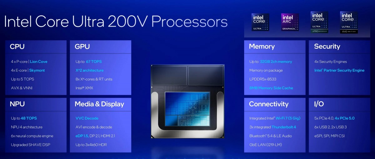 از نظر ورودی/خروجی و اتصالات نیز، پردازنده های جدید سری Core Ultra 200V اینتل از PCI-Express 5، Thunderbolt 4، USB4، HDMI 2.1، DisplayPort 2.1، Wi-Fi 7، بلوتوث 5.4 و Gigabit Ethernet پشتیبانی میکنند.
