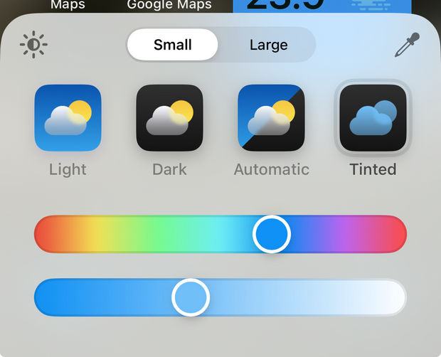 همچنین میتوانید گزینه Tinted (رنگ آمیزی) را لمس کرده و سپس رنگ دلخواه خود را انتخاب کنید. با انتخاب این گزینه، تمام آیکونهای شما به رنگ انتخابی شما تغییر رنگ خواهند داد، حتی اگر این آیکونها برای پشتیبانی از این قابلیت بهروزرسانی نشده باشند. برای انتخاب رنگ از نوار لغزنده اول و برای روشنتر یا تیرهتر کردن رنگ موردنظر از نوار لغزنده دوم استفاده کنید.