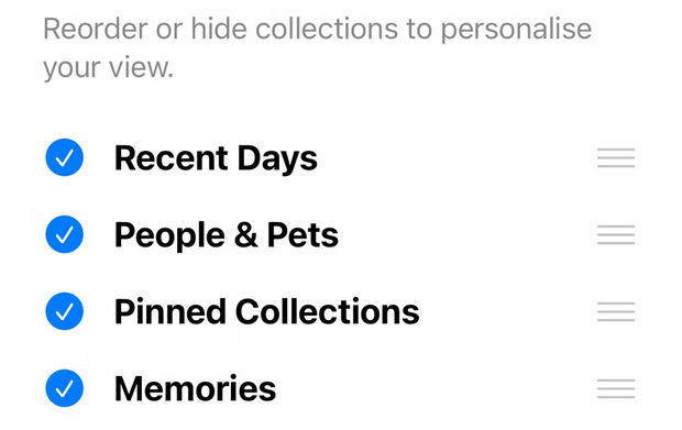 برنامه Photos را باز کرده و به پایین صفحه اسکرول کنید. سپس برای ایجاد تغییرات روی دکمه Customize & Reorder ضربه بزنید. حالا برای فعال یا غیرفعال کردن بخشهای مختلف، روی تیکهای آبیرنگ ضربه بزنید. همچنین میتوانید با استفاده از آیکون همبرگری که به صورت ۳ خط موازی در سمت راست هر بخش قرار دارد، آن بخش را جابهجا کنید. همچنین میتوانید روی دکمه Modify در قسمت Pinned Collections ضربه بزنید تا تنظیمات آن را تغییر دهید.