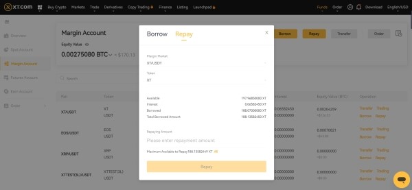 - شما باید با همان ارزی که قرض گرفتهاید، بازپرداخت کنید. برای مثال، اگر XT قرض گرفتهاید، حساب شما باید XT کافی برای بازپرداخت داشته باشد و نمیتوانید از ارزهای دیگر به عنوان جایگزین استفاده کنید.