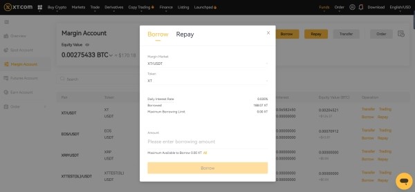 بر اساس آموزش صرافی XT برای ایرانی ها از طریق پلتفرم این صرافی میتوانید از وجوه قرضی برای خرید و فروش ارزهای دیجیتال استفاده کنید. برای این کار، باید ابتدا از حساب اسپات به حساب مارجین وجه منتقل کنید. سپس ارز موردنظر خود را با بررسی نرخ بهره روزانه قرض میگیرید. در ادامه در مورد مراحل این کار، دقیقتر توضیح میدهیم.