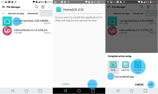 اگر شما روش SmartWorld را انتخاب کردید که هیچ. اما درصورتیکه شما تصمیم به دریافت لانچر بهطور مستقیم گرفتهاید، دستگاه از شما میخواهد میان گزینههای ‘Home’ و ‘EasyHome’ و Home (UX 4.0) یکی را انتخاب کنید. اگر نمیخواهید این سؤال بار دیگر از شما پرسیده شود، لازم است گزینهی Use as default app را تیک بزنید و پسازآن گزینه Home (UX 4.0) را، تا درنهایت کلید OK را تپ کنید و از منو کشویی خود لذت ببرید! اگر دستورالعملهای گفته شده به شما کمکی نکرد، میتوانید از گالری تصاویر زیر راهنمایی بگیرد.