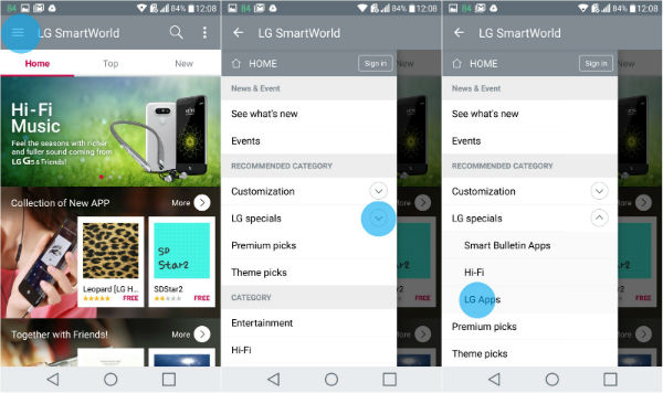 بهمنظور دریافت رابط کاربری UX 4.0 تنها لازم است وارد برنامه LG SmartWorld شوید و پسازآن با باز شدن یک پنجرهی پاپ آپ، میتوانید بهراحتی آن را دانلود و نصب کنید. اما درصورتیکه با ورود به این برنامه، پنجرهی یادشده برای شما باز نشد، لازم است تا با ورود به منو بالا سمت چپ، بر روی گزینه LG specials تپ کنید و پسازآن وارد LG Apps شوید تا گزینهی دانلود نمایان شود.