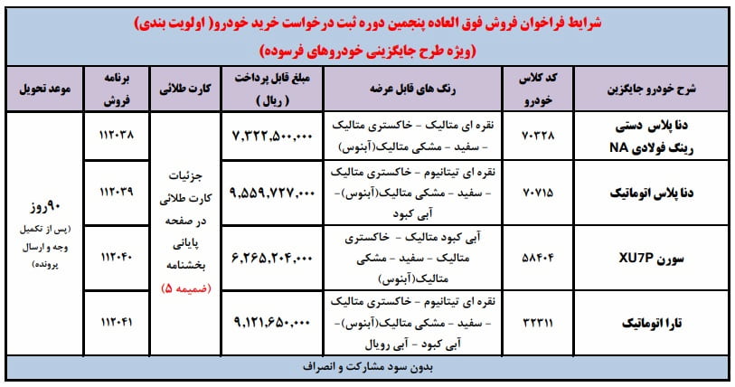 بر اساس این طرح فروش، خودرو دنا پلاس دستی رینگ فولادی با قیمت مصوب ۷۳۲ میلیون و ۲۵۰ هزار تومان، خودرو دنا پلاس اتوماتیک با قیمت مصوب ۹۵۵ میلیون و ۹۷۲ هزار تومان، سورن XU7P با قیمت مصوب ۶۲۵ میلیون و ۵۲۰ هزار تومان و در نهایت خودرو تارا اتوماتیک با قیمت ۹۱۲ میلیون و ۱۶۵ هزار تومان به متقاضیان عرضه میشود. موعد تحویل تمامی محصولات ۹۰ روزه و پس از تکمیل وجه و ارسال پرونده اعلام شده است.