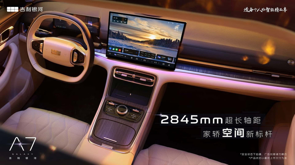 ابعاد بدنه گلکسی A7 شامل 4,918 میلیمتر طول، 1,905 میلیمتر عرض و 1,495 میلیمتر ارتفاع است که با فاصله محوری 2,845 میلیمتر، فضای داخلی وسیعی را برای سرنشینان فراهم میآورد و راحتی بیشتری را به ارمغان میآورد.
