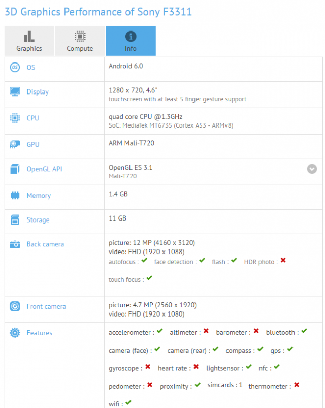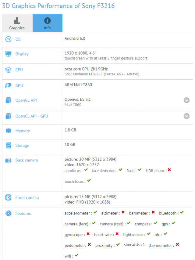 در آن طرف مدل F3216 به یک دوربین 20 مگاپیکسلی در پشت و دوربینی 16 مگاپیکسلی در جلو مجهز شده و این در حالی است که گوشی سونی F3311 از دوربینی 13 مگاپیکسلی در پشت و دوربینی 5 مگاپیکسلی در جلو بهره می‌برد. برای هر دو گوشی جدید سونی سیستم‌عامل اندروید 6.0 مارشمالو در این بنچمارک لیست شده است و خبر خوب آن که سونی قصد دارد رابط کاربری خود را بر بالای این سیستم‌عامل گوگل به نمایش بگذارد.